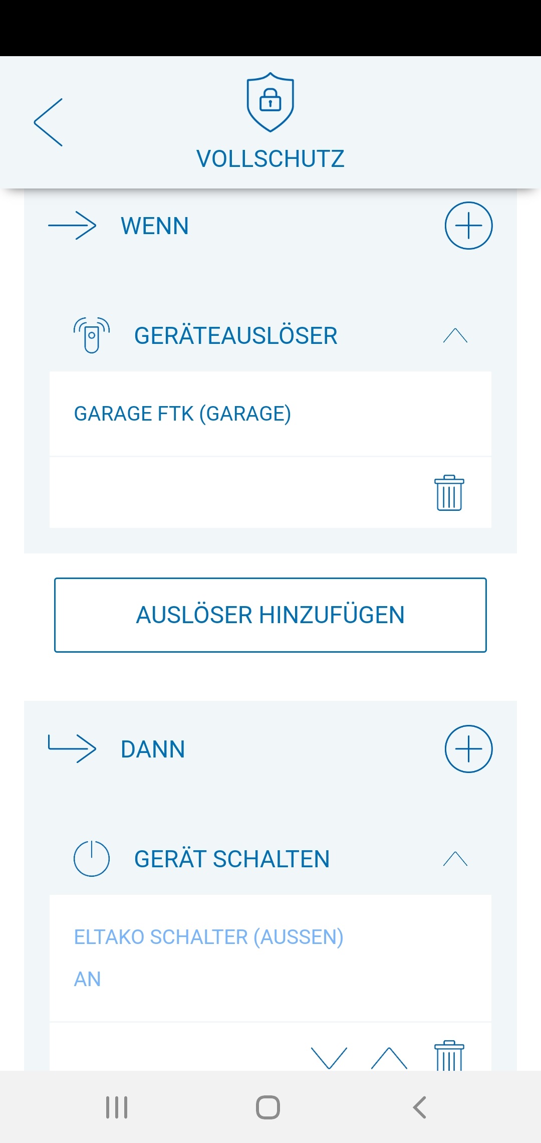 Tippen Sie auf AUSLÖSER HINZUFÜGEN. Jetzt werden Ihnen alle möglichen Auslöser angezeigt. Auslöser sind beschränkt auf Fenstersensoren und Bewegungsmelder. Wählen Sie alle Auslöser aus, die Sie hinzufügen möchten. Der Auslöser lässt sich dabei nicht konfigurieren. Generell löst der Auslöser bei jedem Zustand, außer dem Zustand “geschlossen”, aus. Hat ein Sensor einen Sabotagestatus, zählt dieser auch als Alarmauslöser.