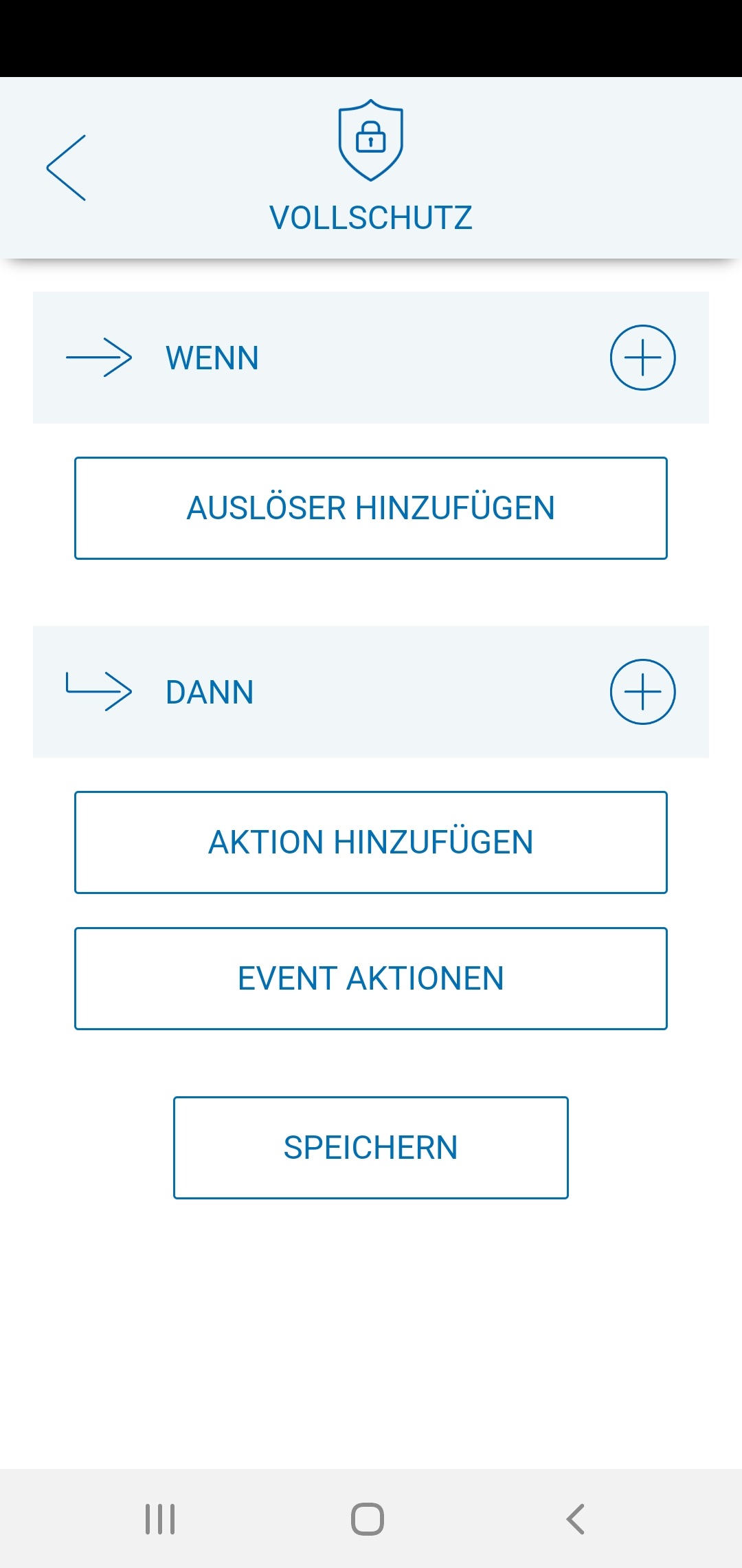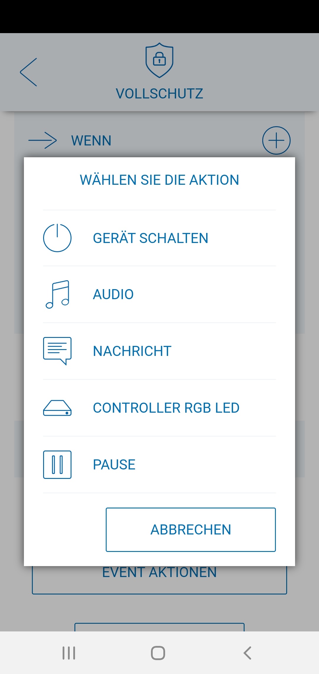 Tippen Sie auf AKTION HINZUFÜGEN, um eine Aktion hinzuzufügen, die im Falle eines Alarms ausgelöst werden soll. Hier gibt es verschiedene Möglichkeiten.
