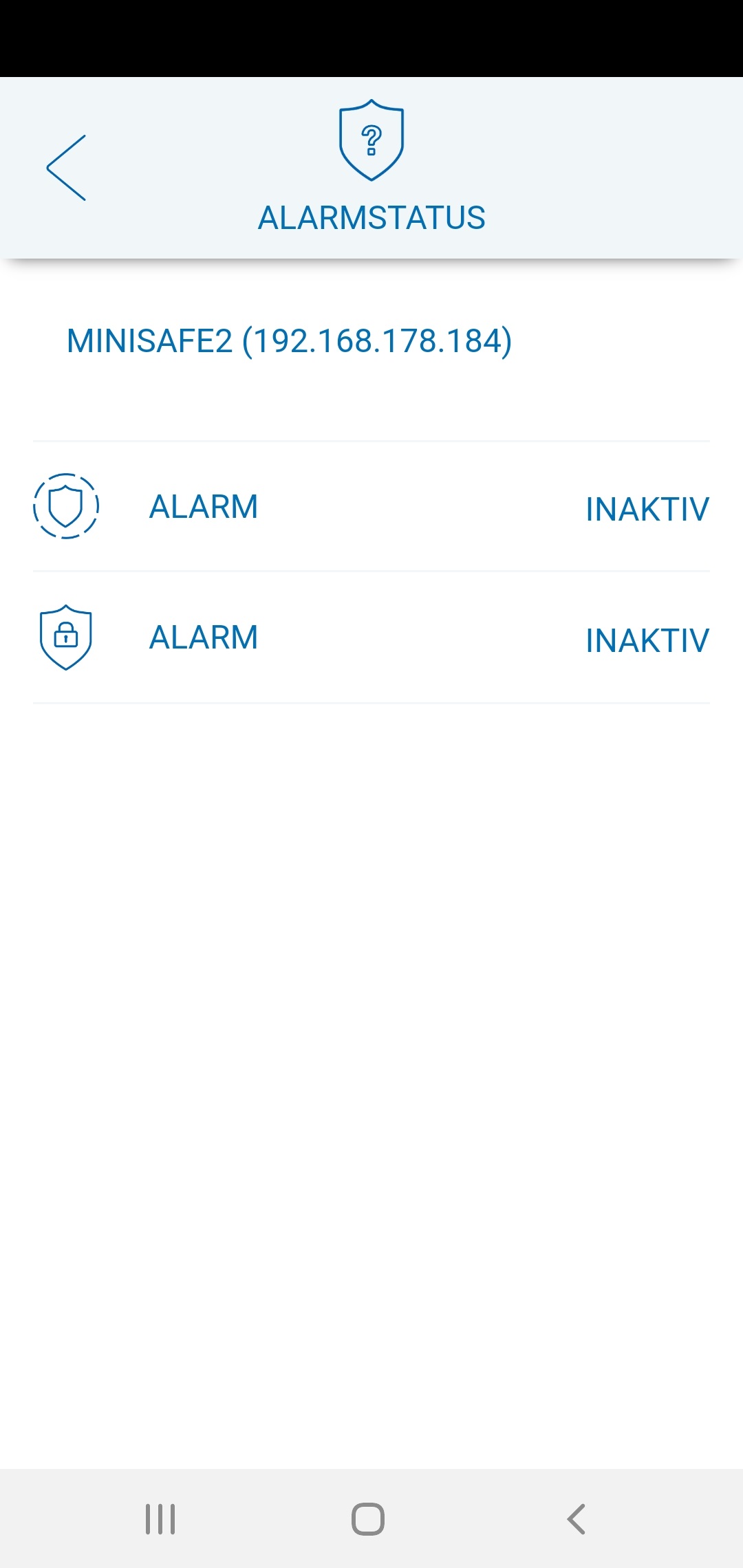 Wenn Sie nicht sicher sind, wie der aktuelle Alarmstatus ist, gehen Sie in die EINSTELLUNGEN -> ALARM. Tippen Sie auf STATUS. Dort sehen Sie den aktuellen Status, gestaffelt nach Controllern (falls mehrere verwendet werden).