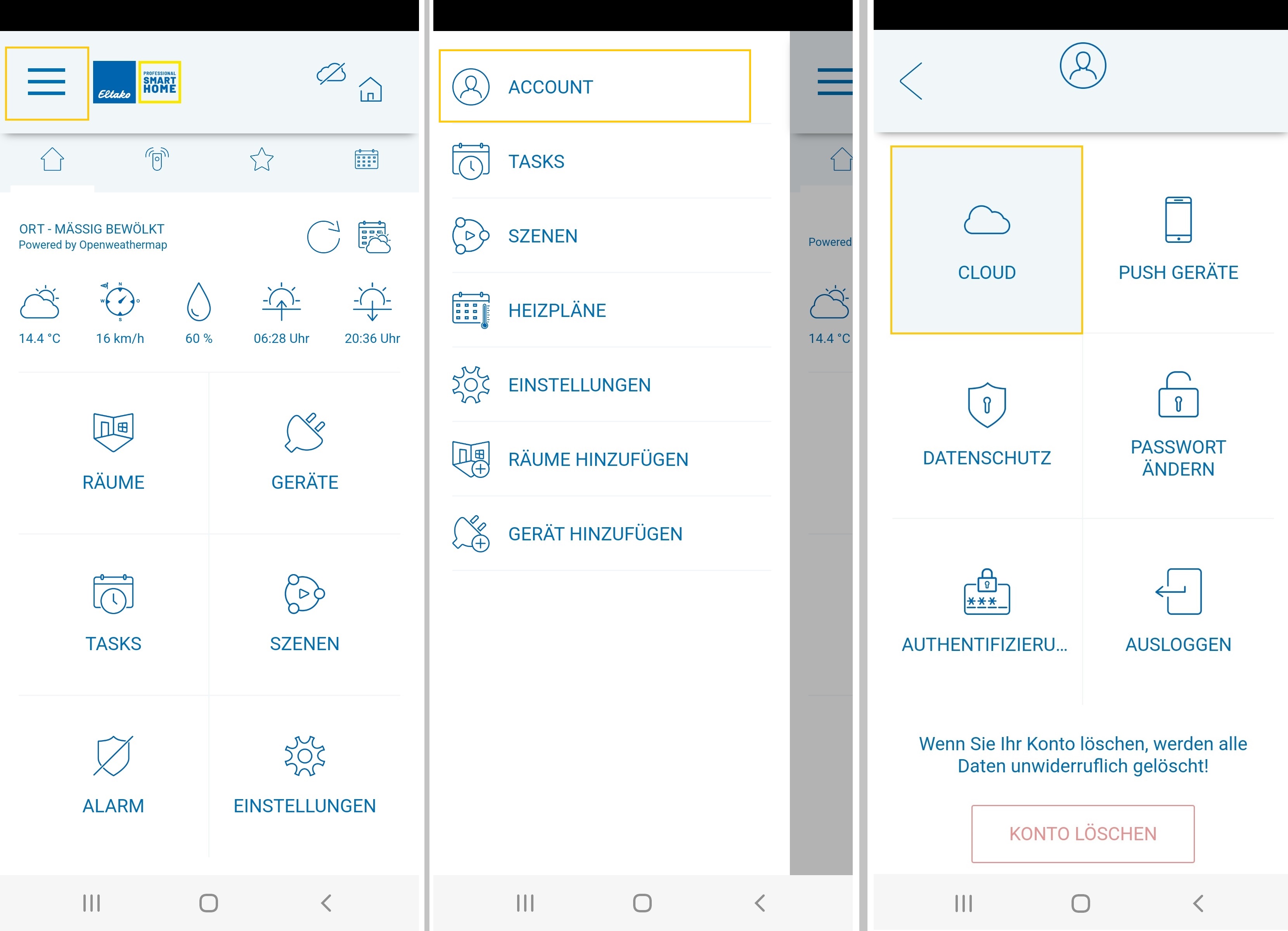 Öffnen Sie das Hauptmenü und wählen über ACCOUNT das Feld CLOUD.