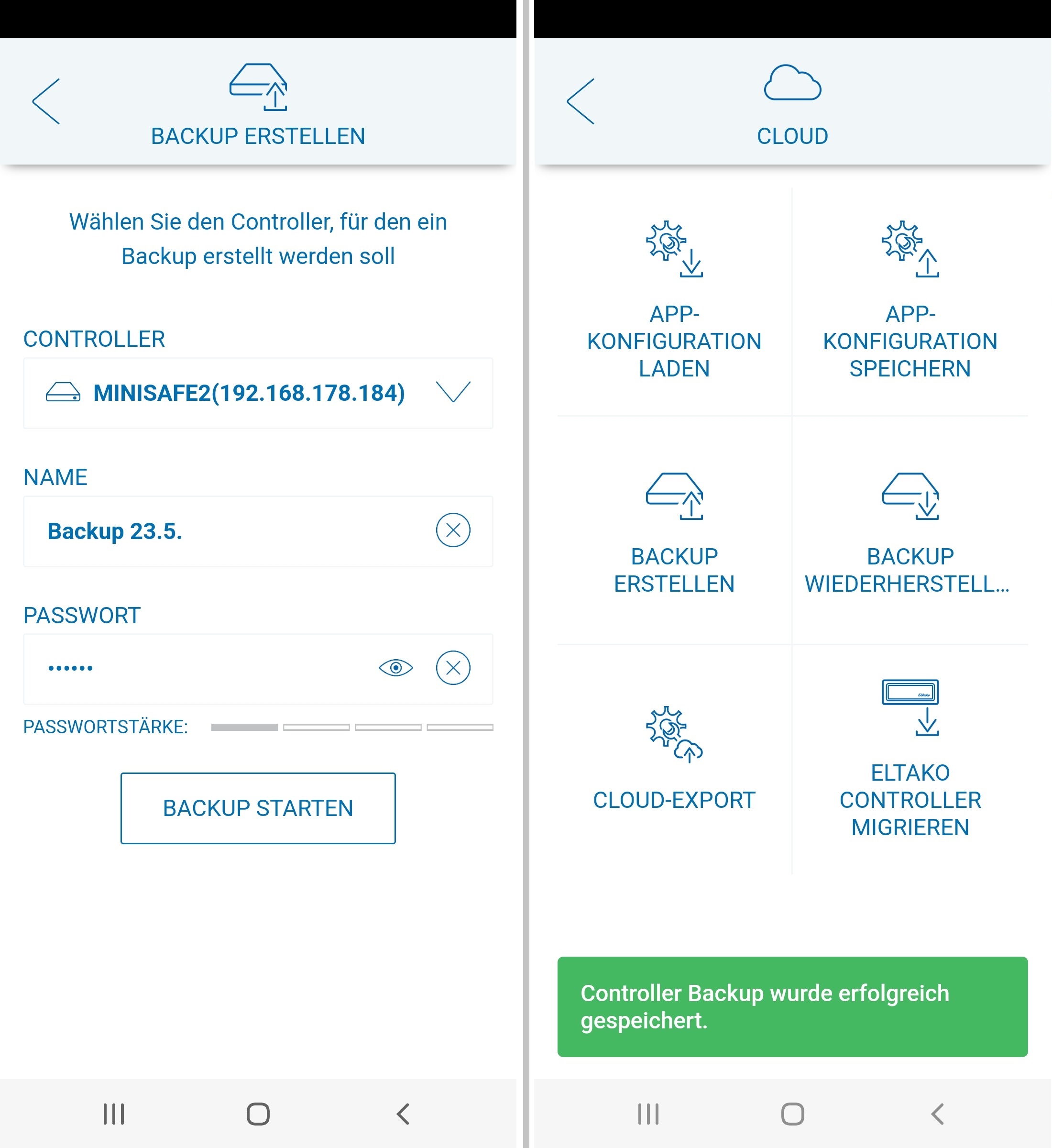 Wählen Sie unter CONTROLLER das gewünschte Gerät aus und vergeben Sie einen Namen und ein Passwort. Tippen Sie nun auf BACKUP STARTEN. Abschließend erscheint die Meldung “Das Controller Backup wurde erfolgreich gespeichert”.