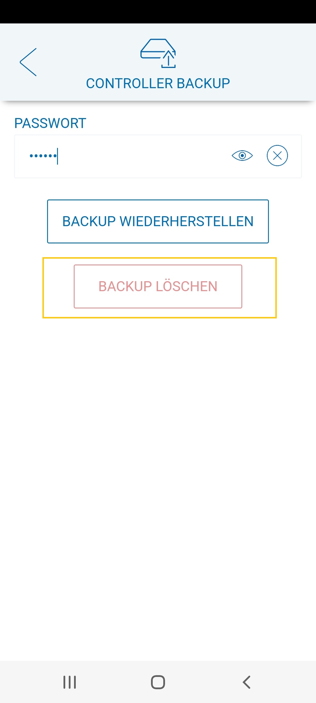 Um ein erstelltes Backup zu löschen, wählen Sie zunächst BACKUP WIEDERHERSTELLEN aus, selektieren dann die entsprechende Datei und tippen auf BACKUP LÖSCHEN. Mit Bestätigung auf JA ist nun noch die Eingabe des Account Passwort notwendig.