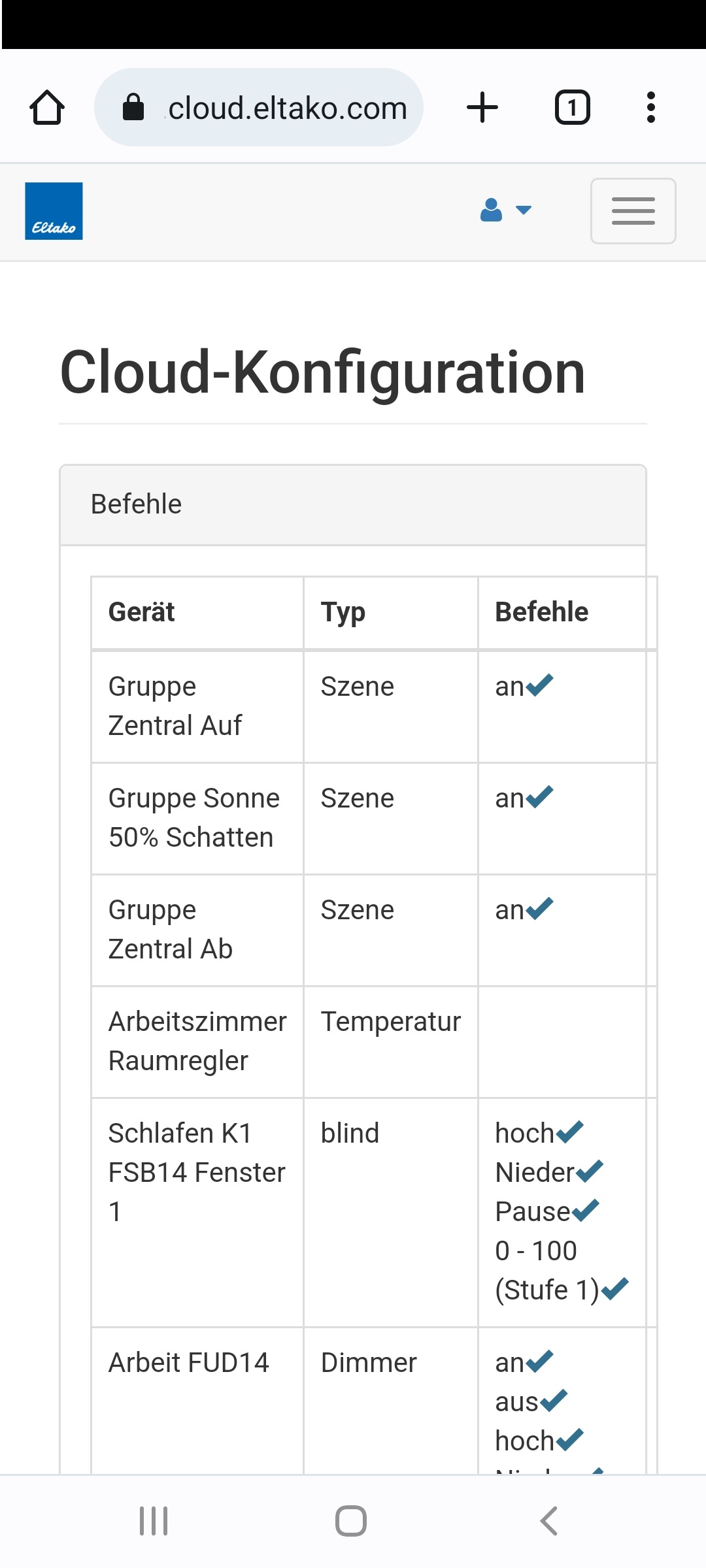 Unter BEFEHLE finden Sie alle in die Cloud übertragenen Geräte, die mit dem jeweiligen Gerät verknüpften Befehle und deren Typ. Unter dem CLOUD-KONFIGURATION werden Informationen zu Kommandos und Aufrufe angezeigt.