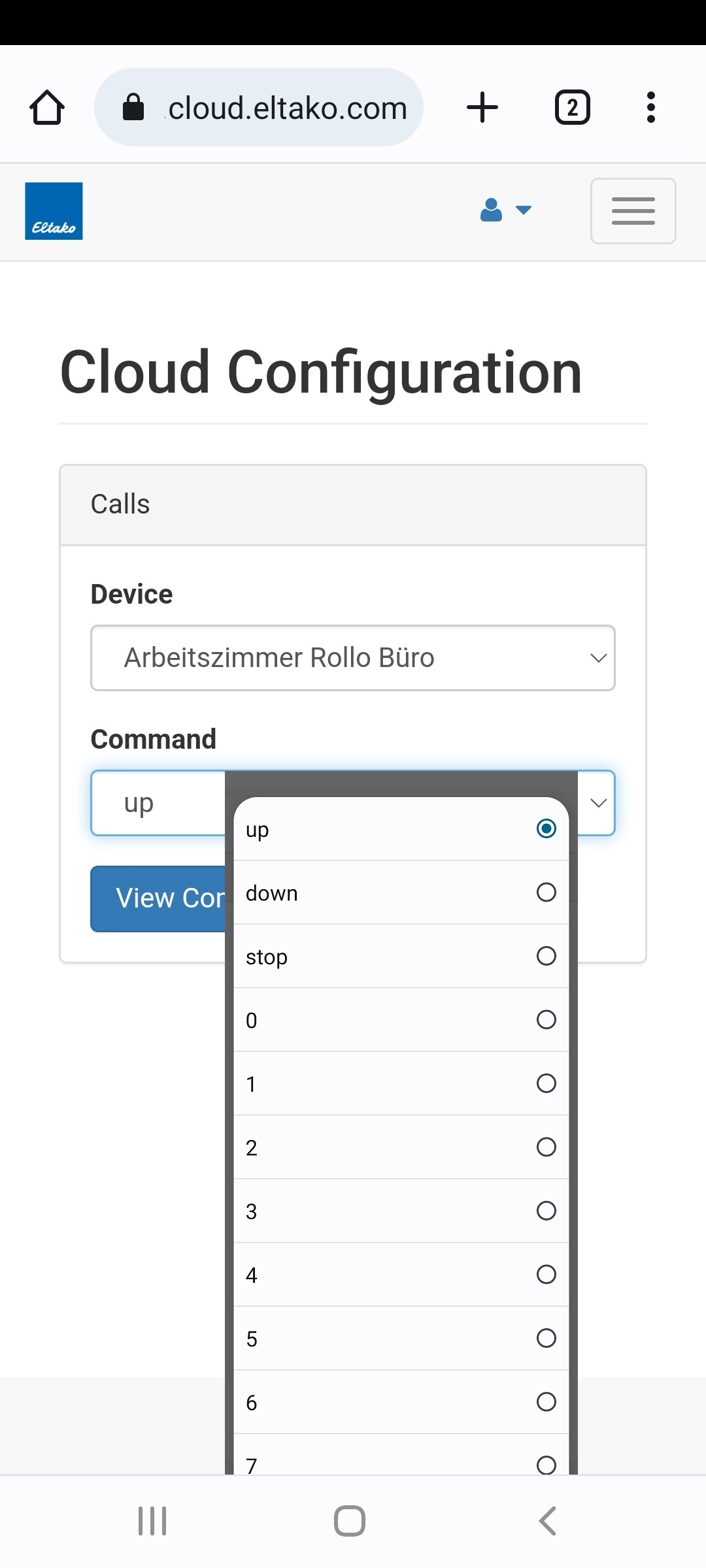Unter BEFEHLE finden Sie alle in die Cloud übertragenen Geräte, die mit dem jeweiligen Gerät verknüpften Befehle und deren Typ. Unter dem CLOUD-KONFIGURATION werden Informationen zu Kommandos und Aufrufe angezeigt.