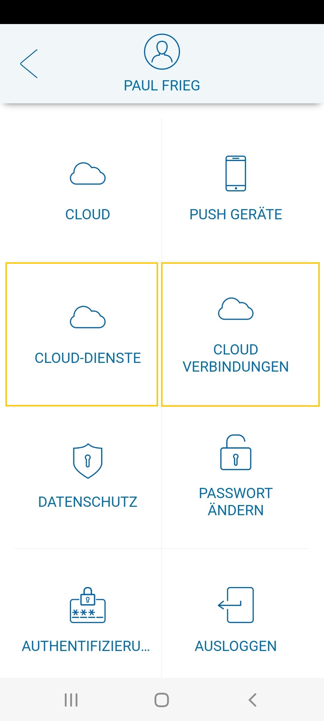 Haben Sie gültige Cloud Dienste, können Sie anschließend die Cloud-Verbindung einrichten. Dafür tippen Sie unter ACCOUNT –> CLOUD –> CLOUD VERBINDUNGEN.