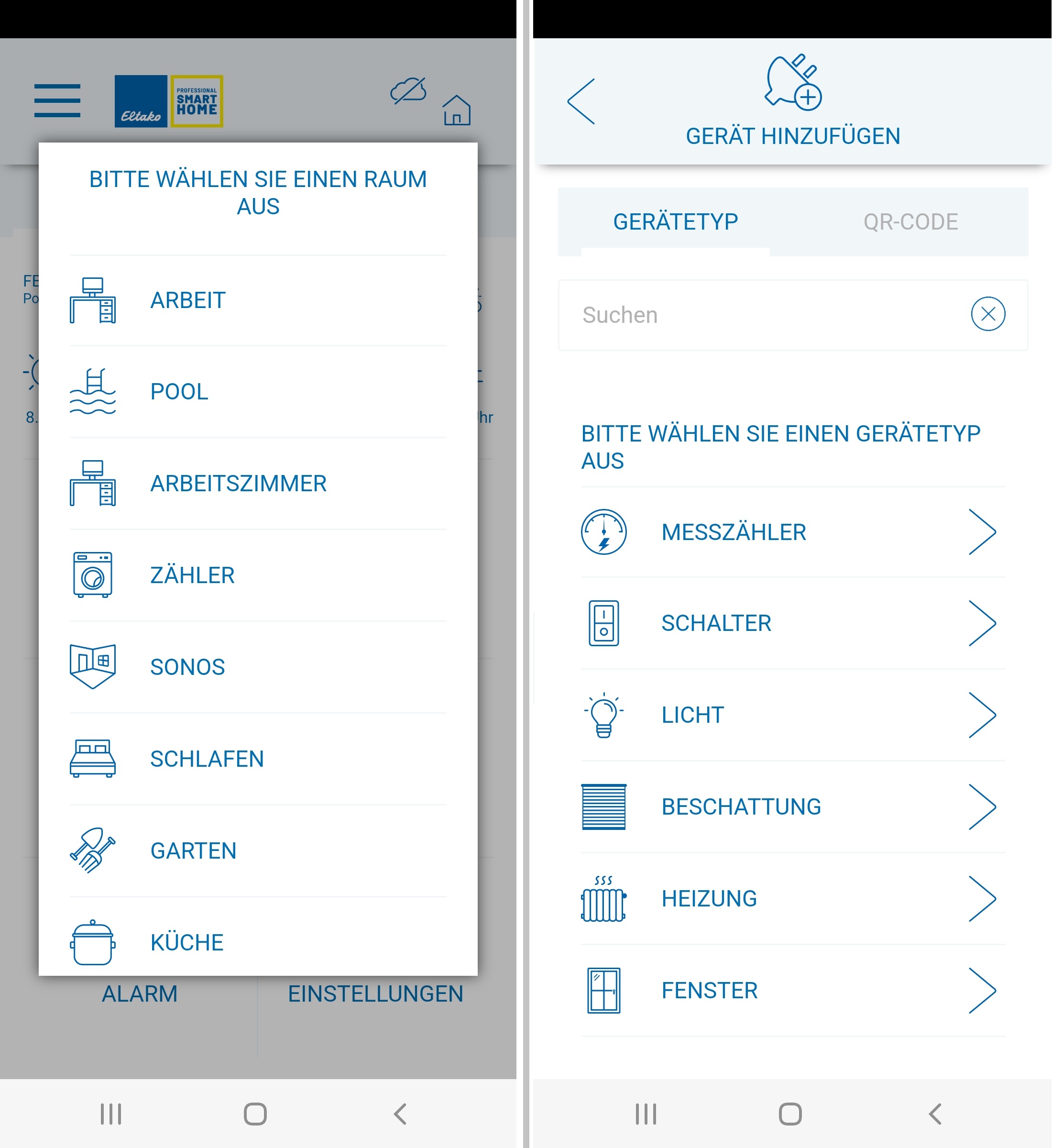Um die Cloud-Geräte nun zu importieren, wählen Sie im Hauptmenü GERÄT HINZUFÜGEN. Wählen Sie den RAUM, in den das Gerät hinzugefügt werden soll, oder legen Sie zunächst einen Raum an.