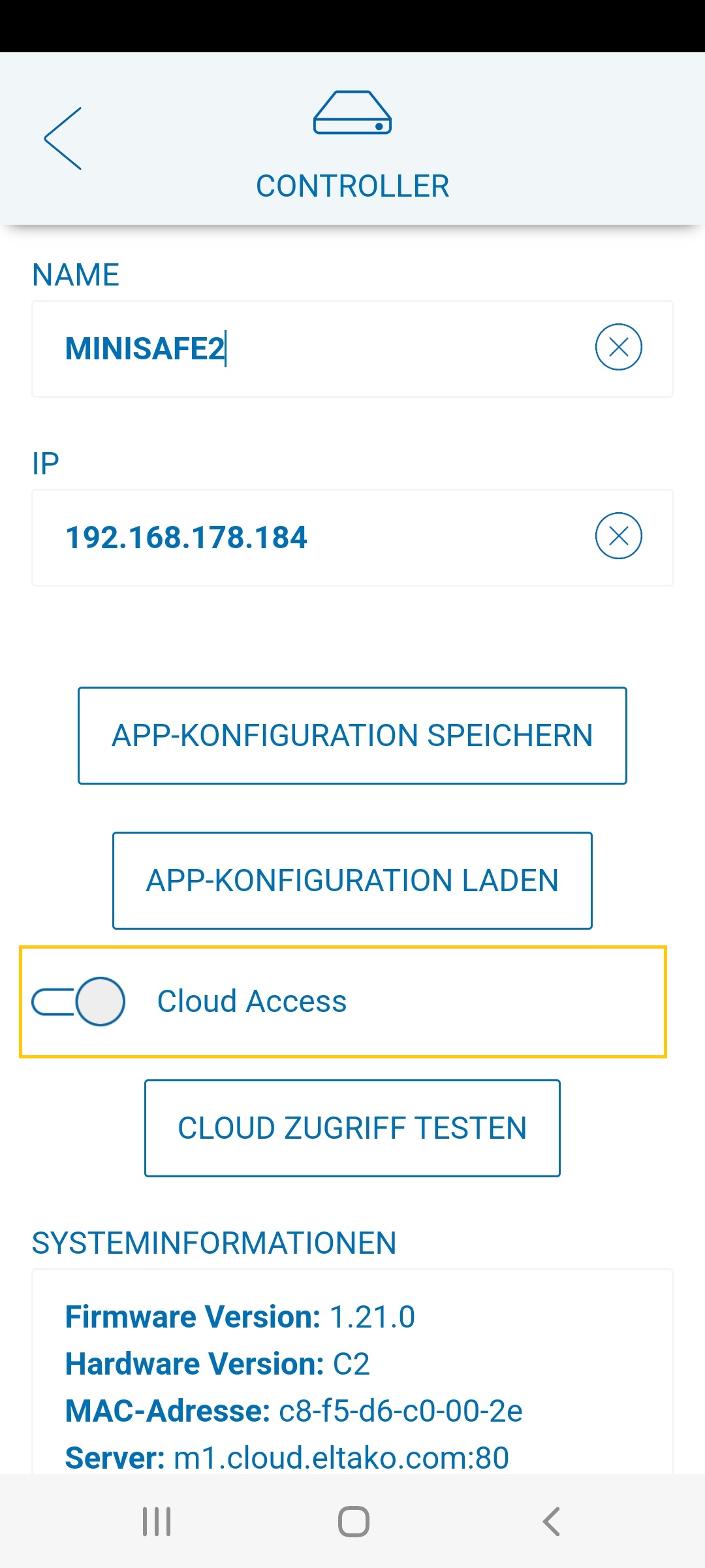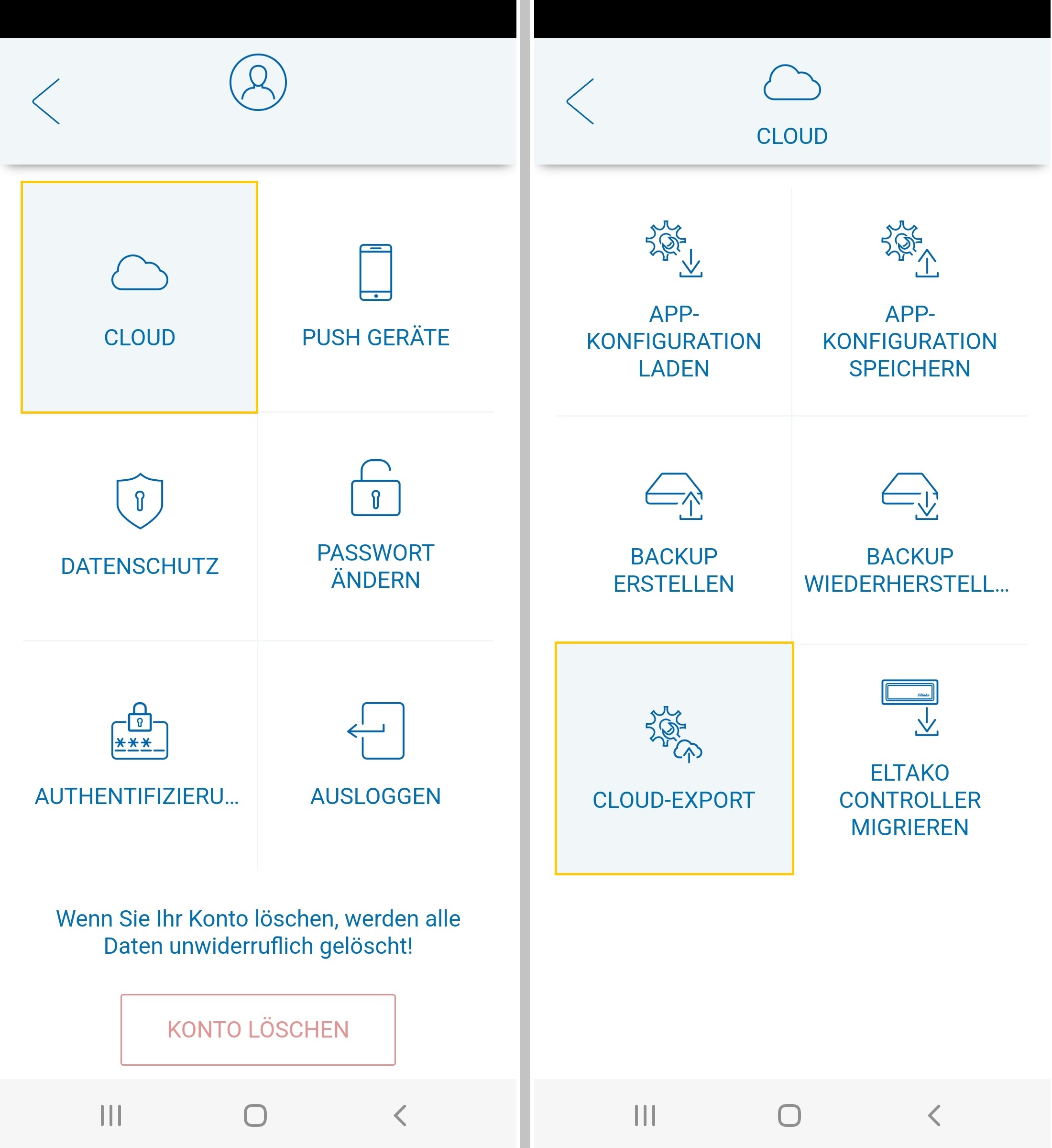 Im Anschluss können Sie Ihre Geräte in die ELTAKO-Cloud exportieren. Tippen Sie dazu unter ACCOUNT auf CLOUD.