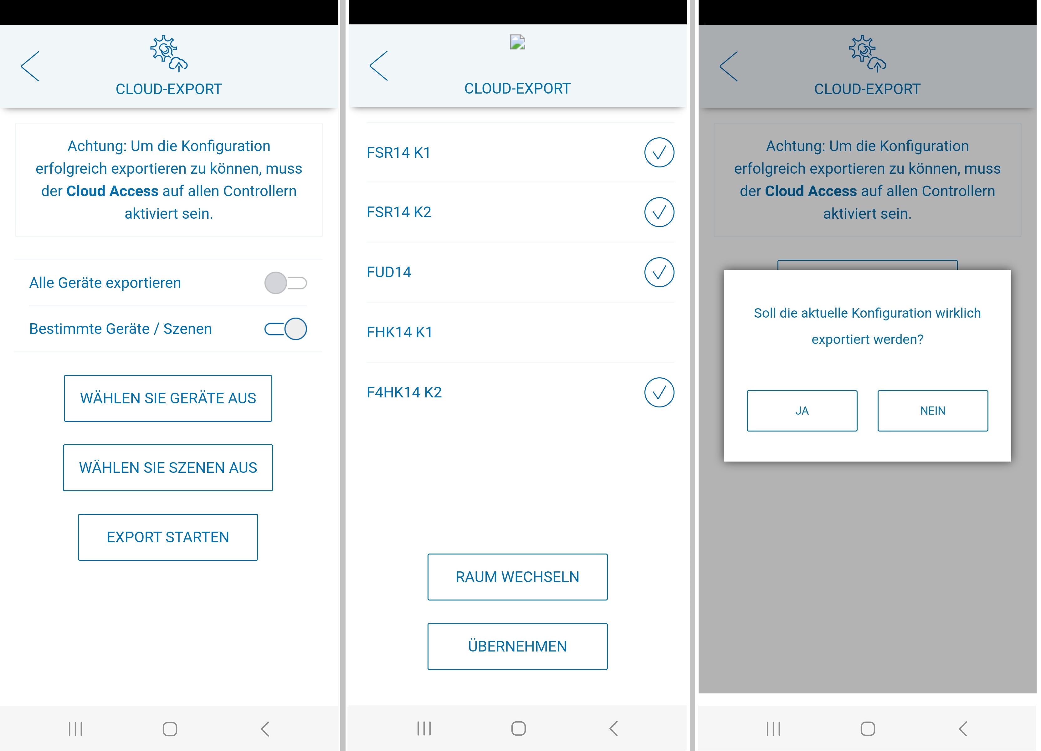 Sie haben die Wahl, alle oder nur bestimmte Geräte zu exportieren. Für eine Geräteauswahl betätigen Sie den Schalter BESTIMMTE GERÄTE EXPORTIEREN. Hier können Sie raumweise die gewünschten Geräte oder Szenen selektieren und abschließend die Einstellungen ÜBERNEHMEN. Tippen Sie nun auf Export starten und bestätigen Sie, dass die Konfiguration exportiert werden soll. Nach dem erfolgreichen Export in die Cloud erscheint im unteren Bereich