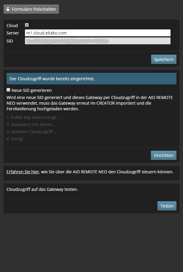 Klicken Sie im Anschluss auf EINRICHTEN. Der Zugriff auf die Cloud wird nun eingerichtet und aktiviert. Abschließend kann der Zugriff noch mit einem Klick auf TESTEN getestet werden.