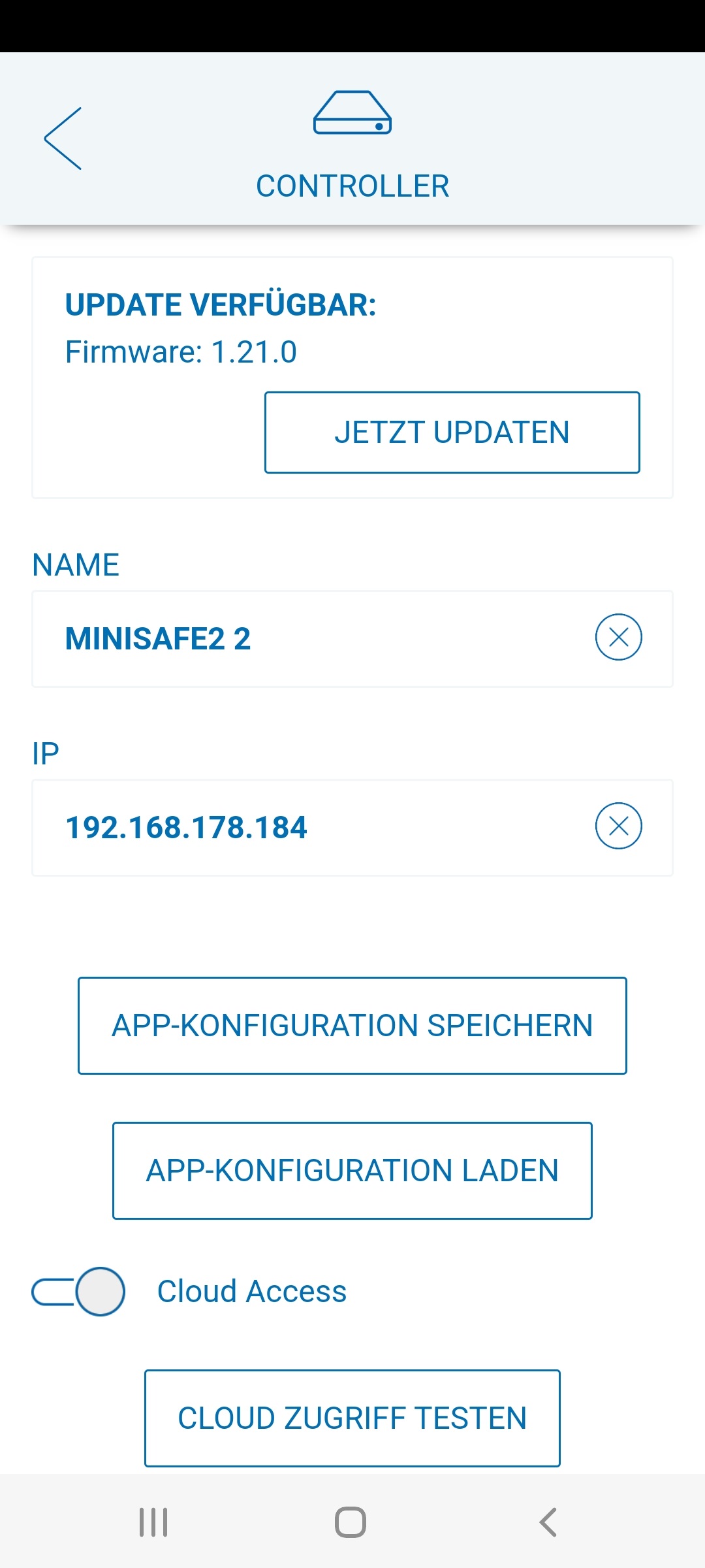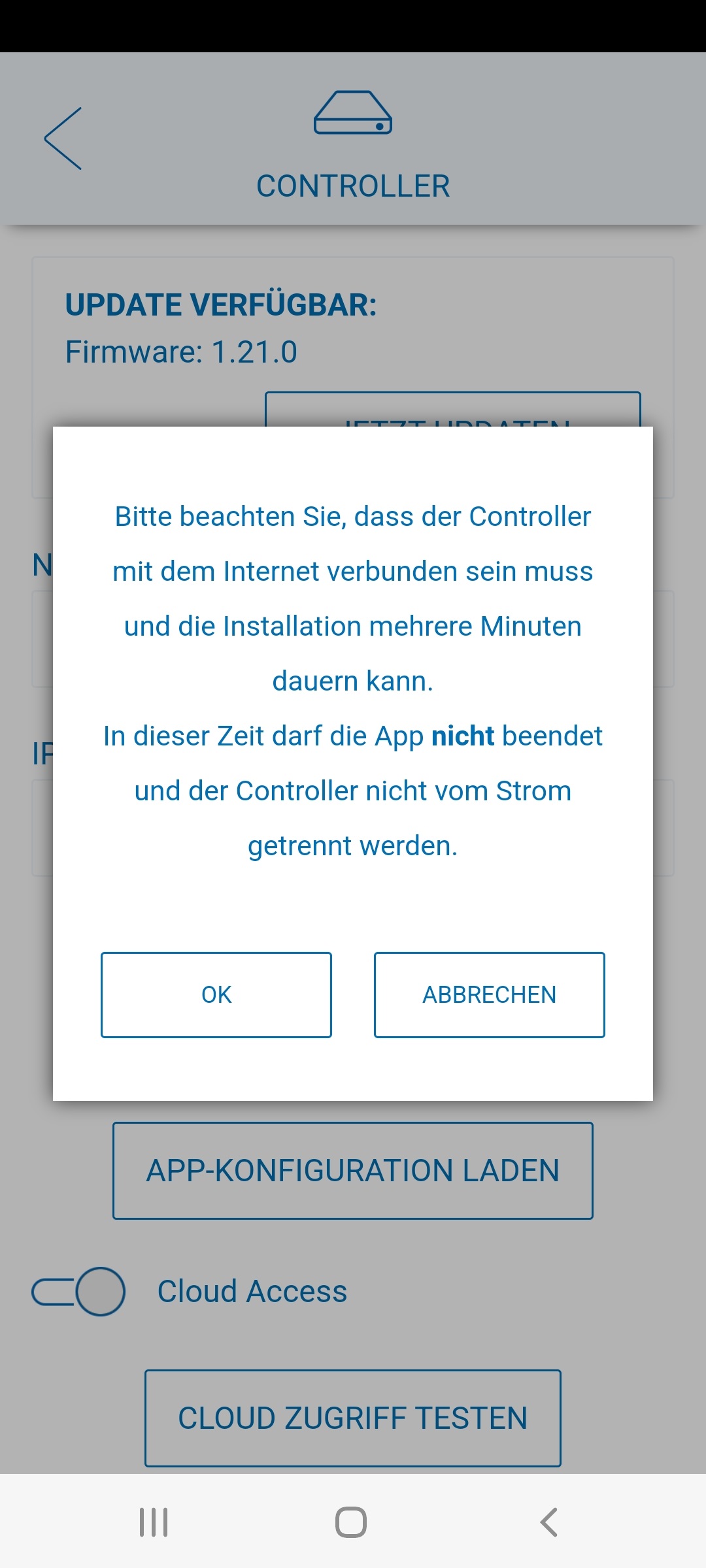 Ganz oben in den Controller-Einstellungen finden Sie eine Meldung, sofern ein neues Firmware-Update verfügbar ist. Tippen Sie auf JETZT UPDATEN, um die neueste Version zu installieren. Haben Sie bereits die neueste Firmware-Version auf Ihrem Controller installiert, wird diese Meldung nicht angezeigt.