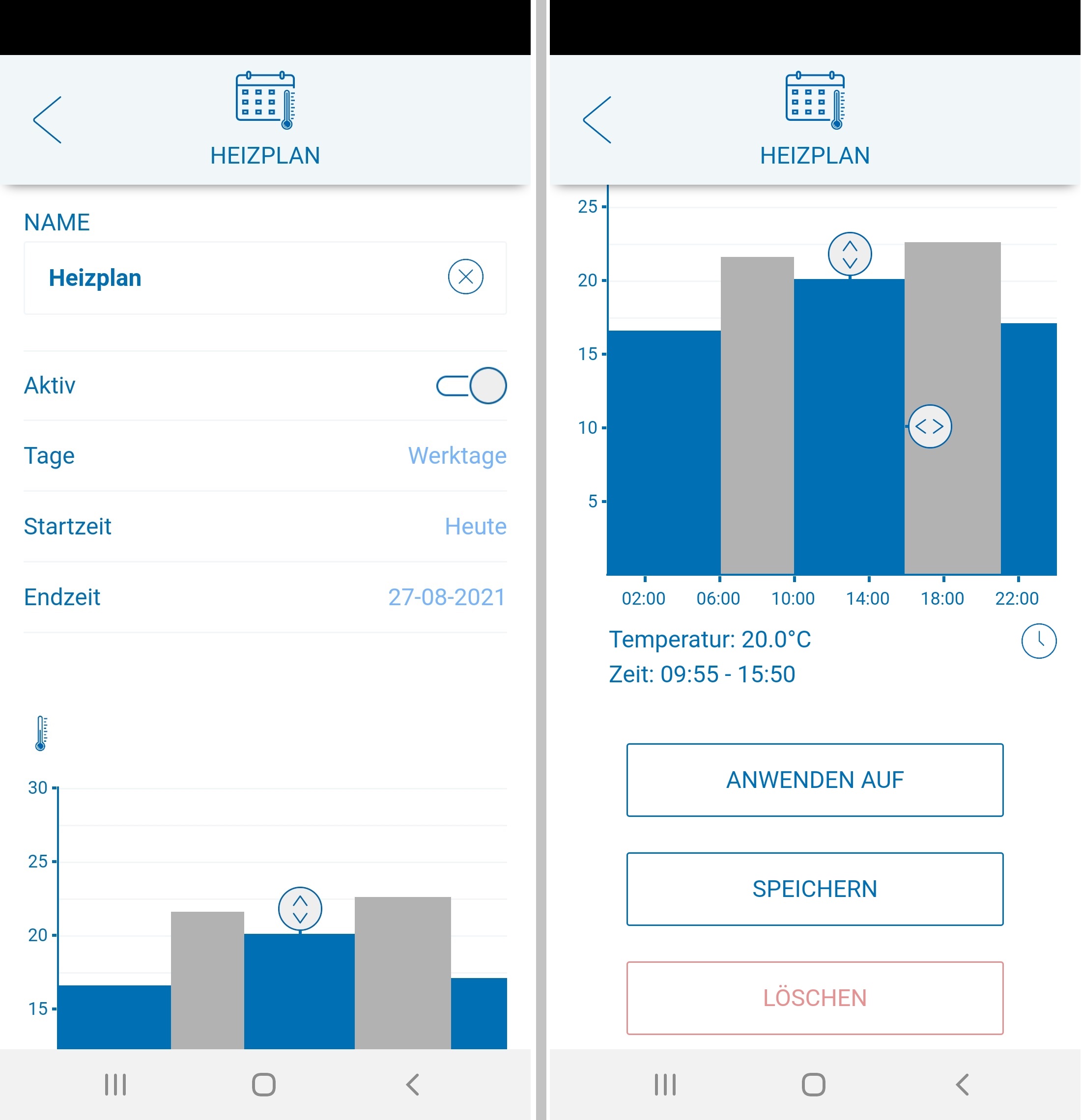 Die 24 Stunden des Tages sind in fünf Heiz-Zeiträume (Blöcke) unterteilt. Diese Blöcke lassen sich durch einfaches Antippen selektieren und in Länge (Zeit) und Höhe (Temperatur) beliebig anpassen.