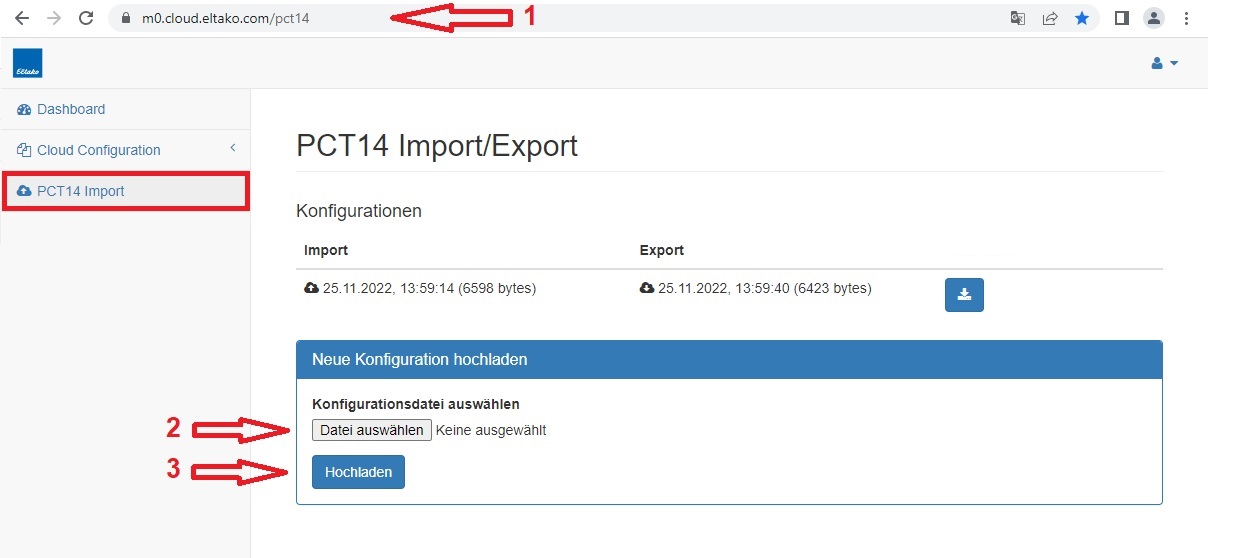 auf (1.), und melde dich im Account an. Wechsel im linken Fenster auf PCT14 IMPORT. Unter DATEI AUSWÄHLEN (2.) kann die exportierte Datei gesucht werden. Klicke danach auf HOCHLADEN (3.), um diese in der CLOUD zu übergeben.