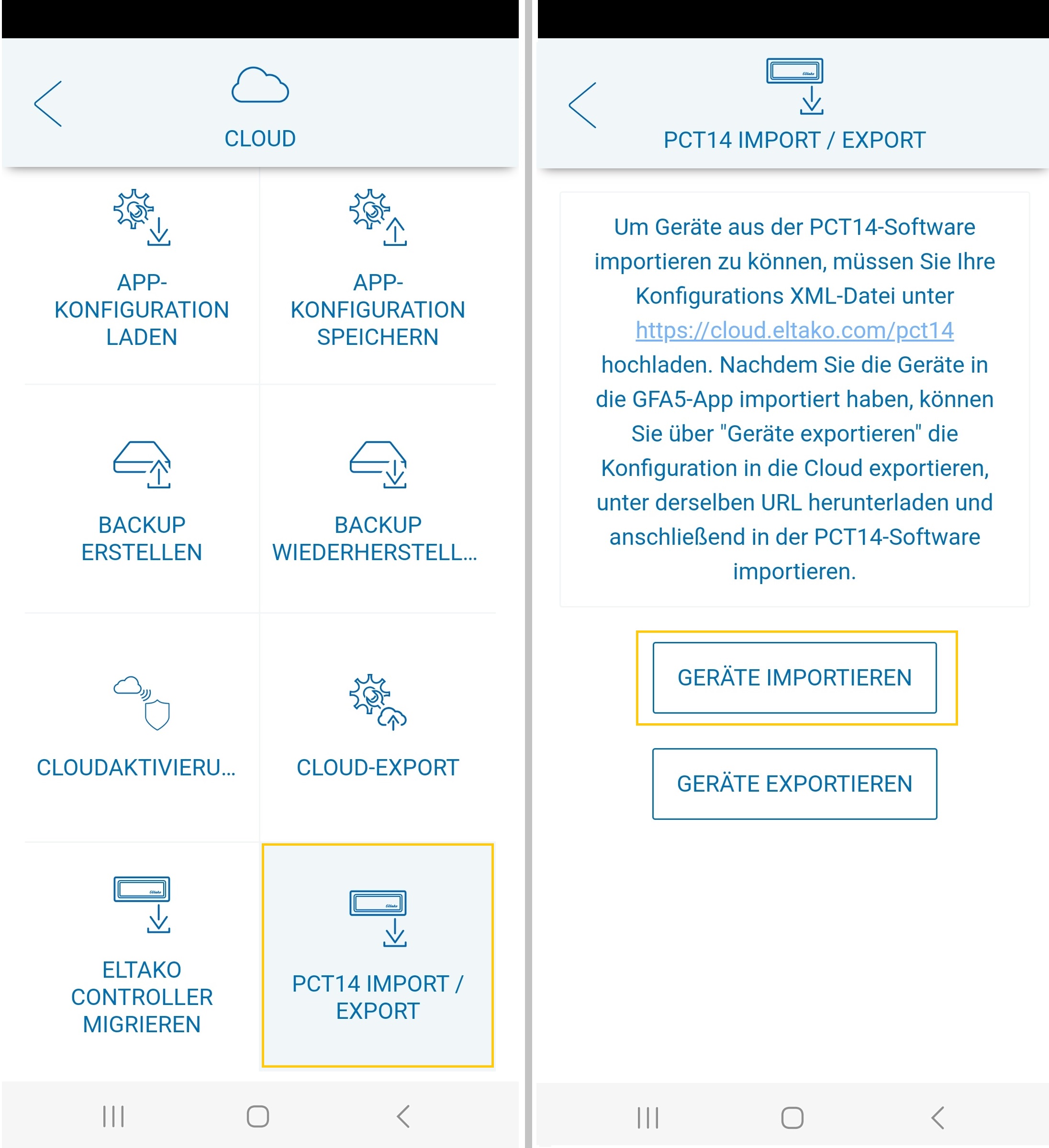 Wechsel zur APP GFA5 und wähle ACCOUNT/CLOUD/PCT14 IMPORT-EXPORT.