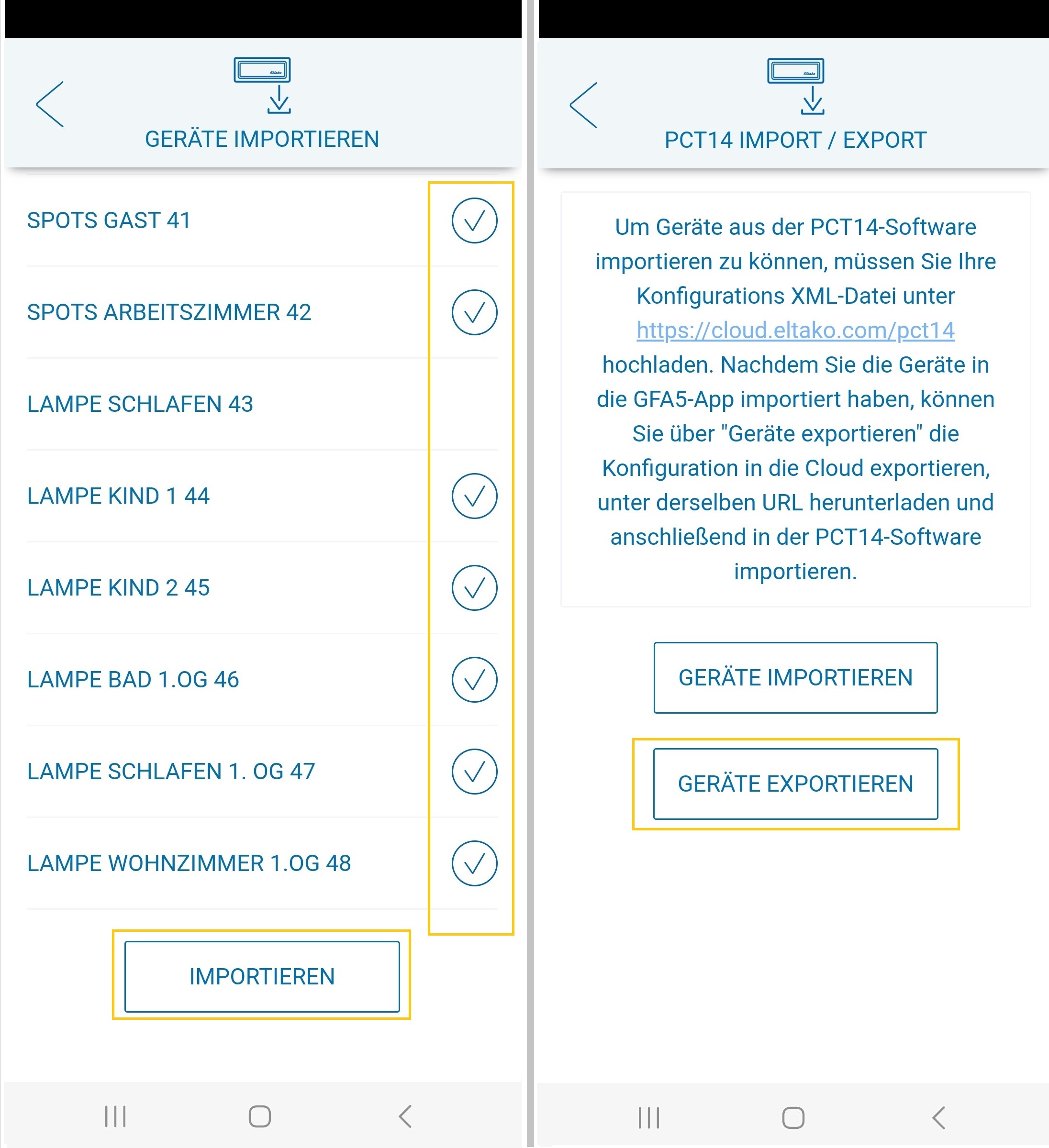 Das manuelle Anlegen und Einlernen von vielen Aktoren ist sehr zeitaufwendig. Ab der App-Version 1.7 und Firmware 1.24 besteht die Möglichkeit der automatischen Geräteerstellung mit Hilfe der ELTAKO PCT14-Software. Durch eine generierte Austauschdatei werden alle wichtigen Gerätedaten zur Erstellung der Objekte in der GFA5 App erzeugt. Im Gegenzug liefert die App eine erweiterte Austauschdatei, die wiederum in Baureihe 14 importiert wird. So erhält jeder Gerätekanal einen GFA5-Dateneintrag (GFVS-Kommando). Der Import/Export erfolgt in 6 Schritten.