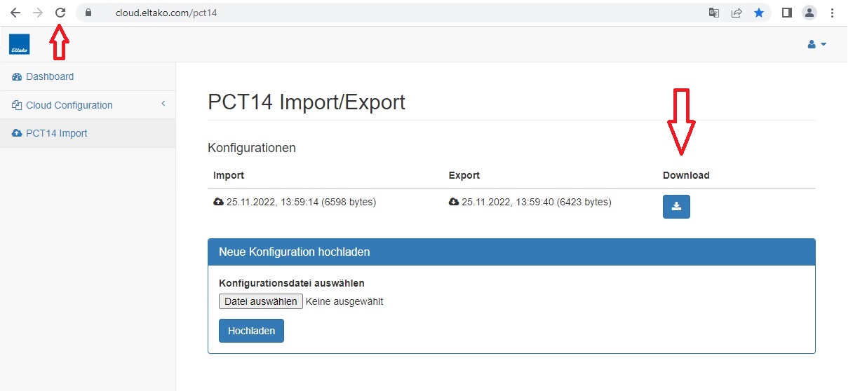 Über GERÄTE EXPORTIEREN wird eine neue Datei generiert, in der die erzeugten Referenzeinträge für PCT14 in die Cloud übergeben werden. Es folgt eine grüne Statusmeldung, dass der Export erfolgreich war und heruntergeladen werden kann.