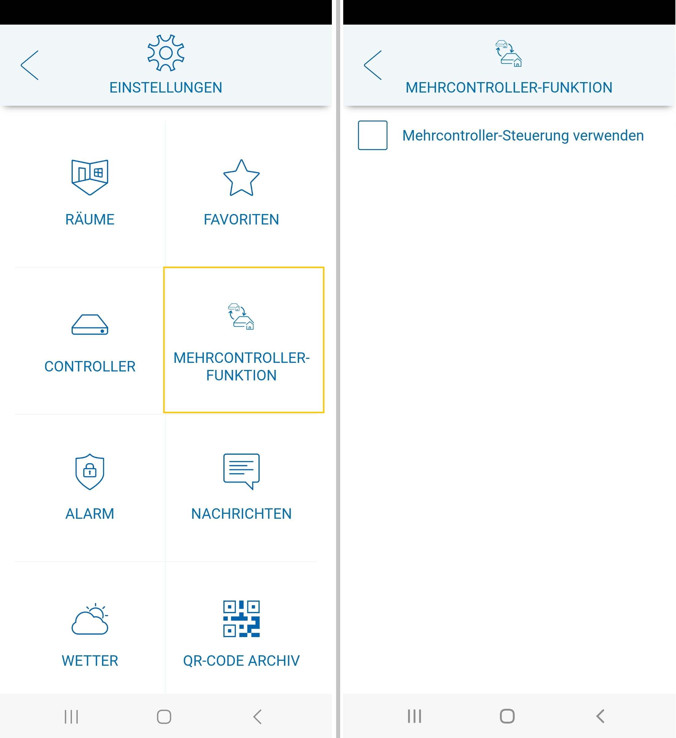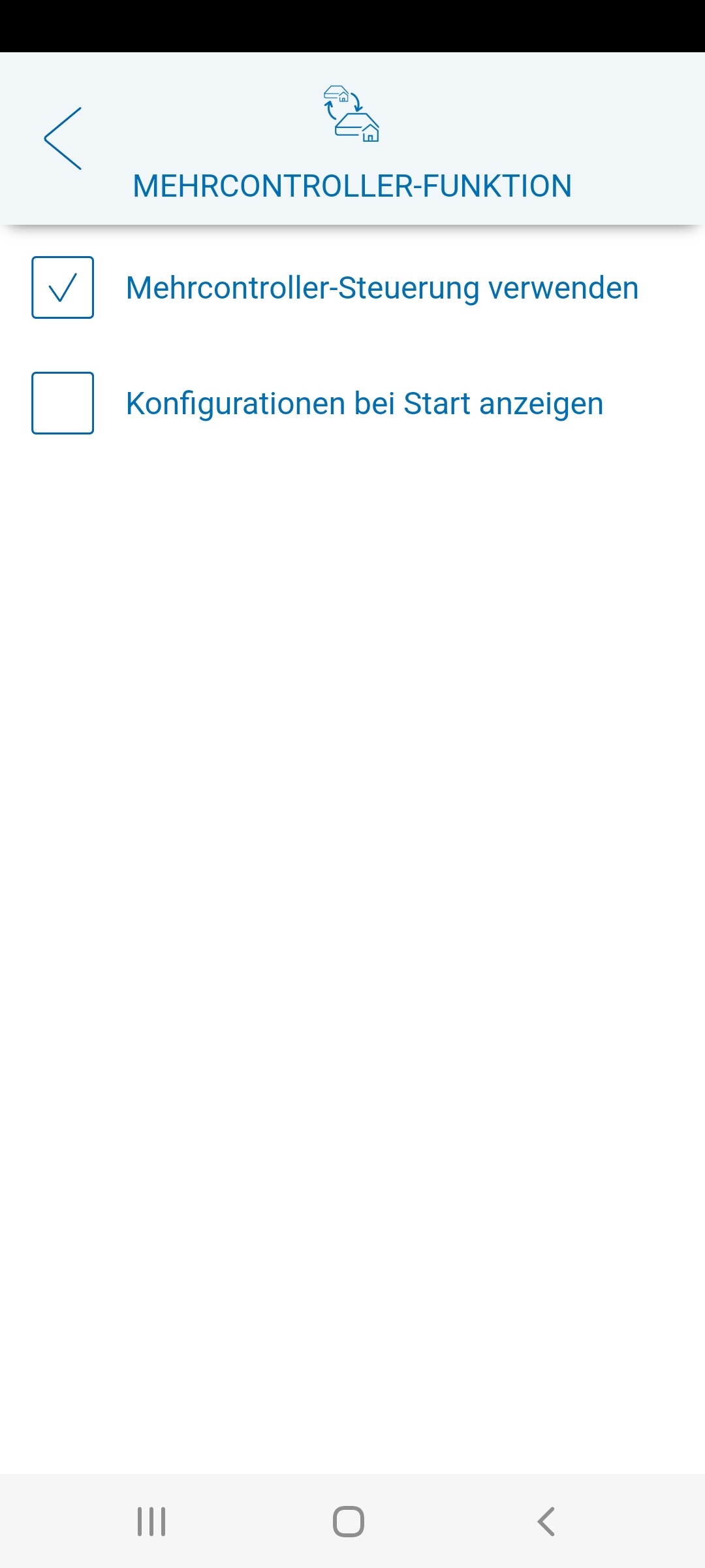 Ist kein Haken gesetzt, kann die Mehrcontroller-Konfiguration nur über ACCOUNT -> MEHRCONTROLLER-KONFIGURATION geändert werden. Alternativ kann der Haken auch wieder gesetzt werden, falls die Konfigurationen doch bei App-Start angezeigt werden sollen.