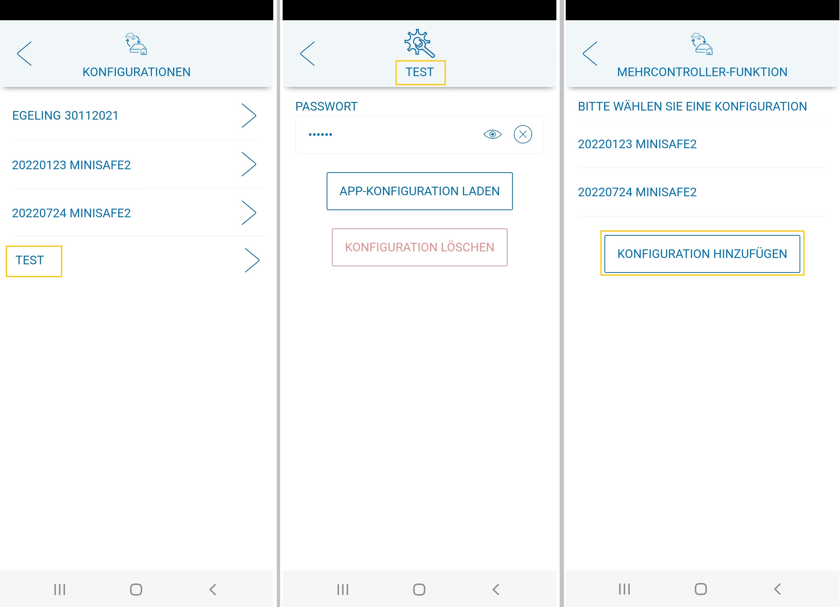 Die Konfiguration wird hierbei lokal in der App gespeichert, sodass ein schnelles Wechseln der Konfigurationen gegeben ist. Wurde eine Konfiguration geladen, wird diese in einer Liste angezeigt.
