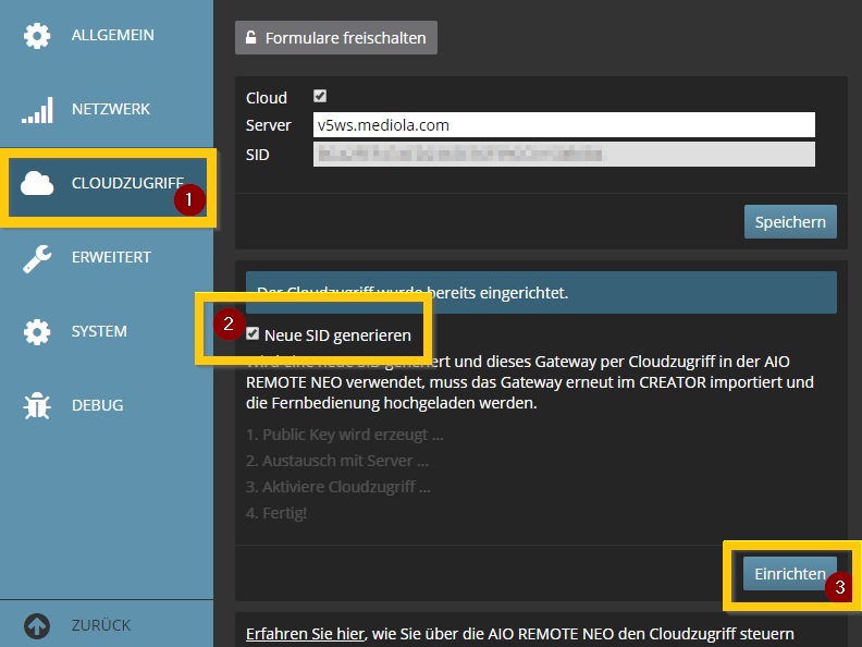 Anschließend gehen Sie auf CLOUDZUGRIFF und wählen den Punkt NEUE SID GENERIEREN (Checkbox anhaken), dann auf EINRICHTEN klicken.