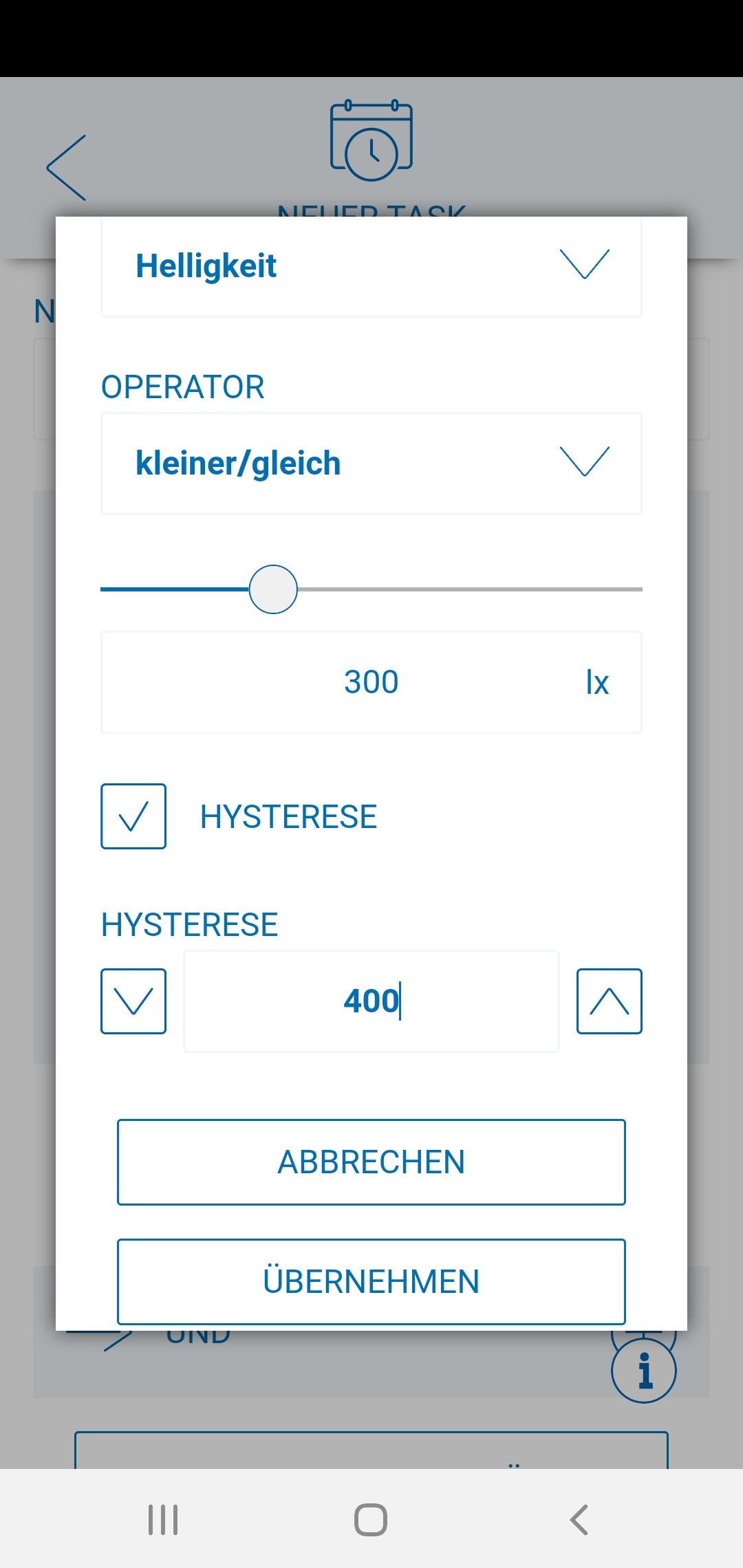 Die Lösung bietet hier der sogenannte Hysterese-Wert. Dieser legt fest, dass der Task erst ein weiteres Mal ausgeführt wird, wenn der angegebene Hysterese-Wert unterschritten wird. Im Beispiel mit der Helligkeit 400 lux bedeutet das, dass der Task beim ersten Überschreiten der 400-Marke einmalig ausgelöst und dann erst wieder, nachdem der Wert unter 300 (eingestellter Hysterese-Wert) gefallen ist.